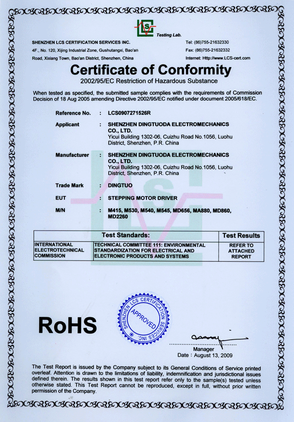 步進驅(qū)動器RoHS認證證書
